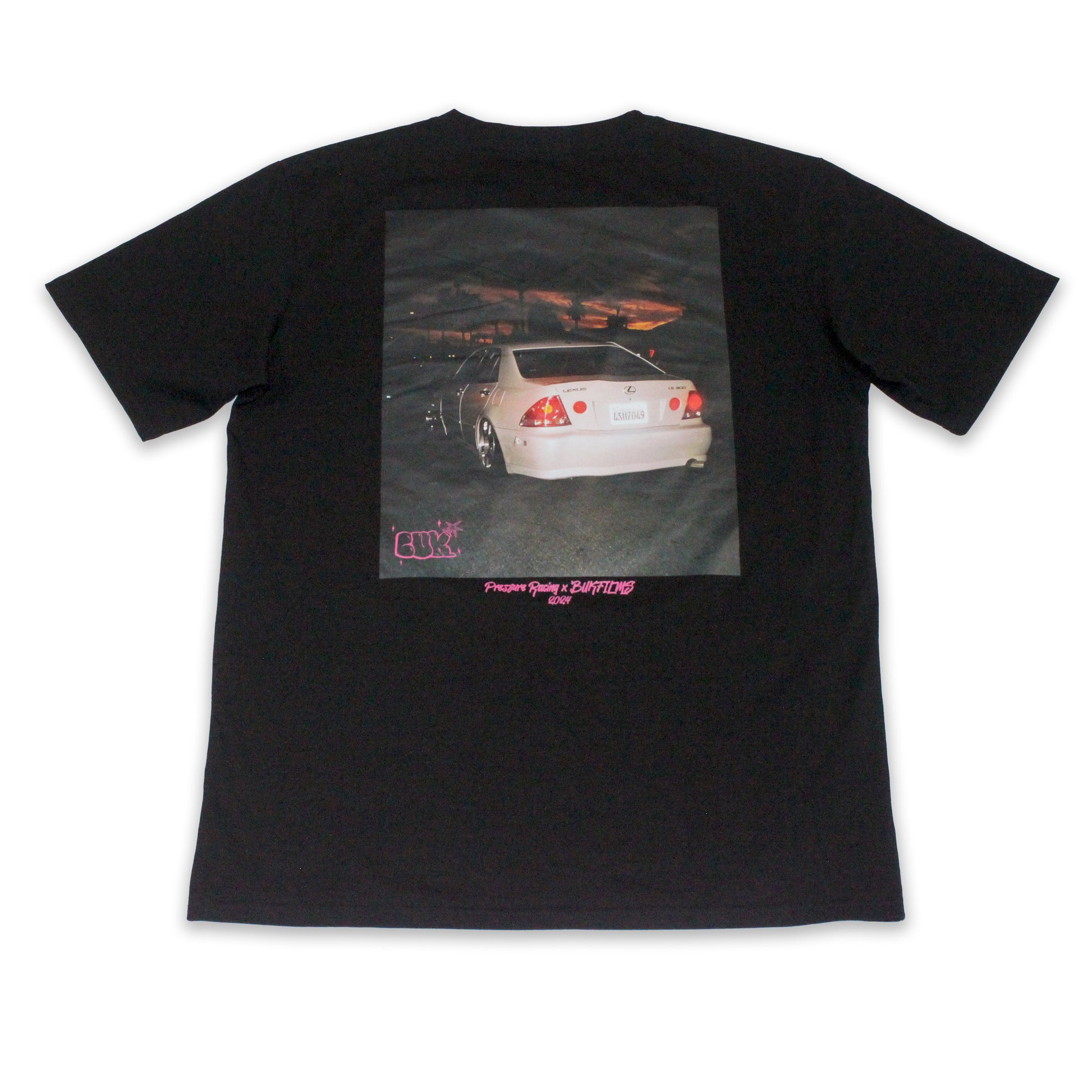 Includes one Pressure Racing x BukFilms collaboration t-shirt with embroidered Pressure Racing logo (pink theme)